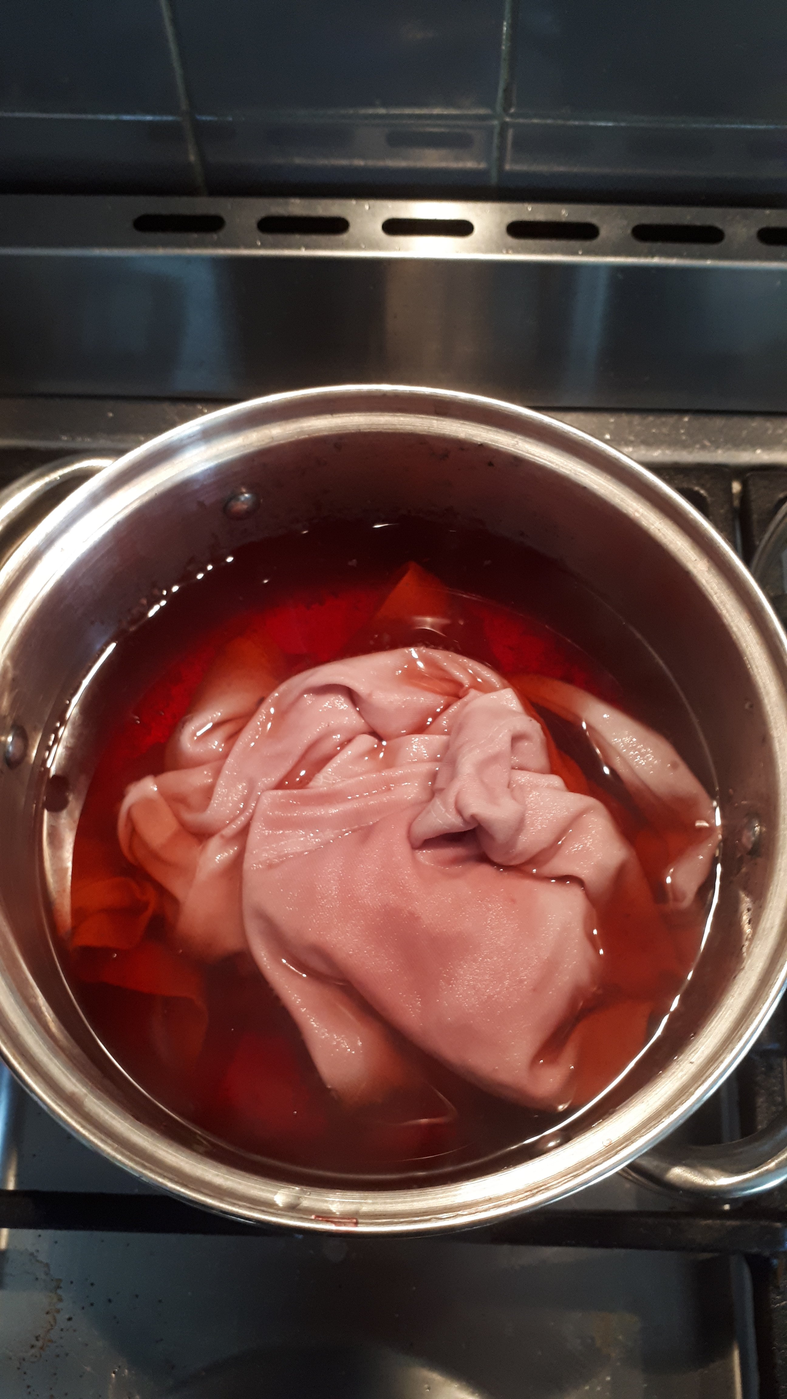 Like many craft projects, upcycling doesn’t always turn out as planned. Anyone who has kids knows they don’t mix well with white clothing, so I thought I’d try using natural dyes from strawberries and cabbage to give them a bit of colour. I was imagining my end product would turn out to be beautiful dusty pinks and lavender shades of purple. Nope. As you can see the end result is more like a roll in the dirt than either pink or purple.