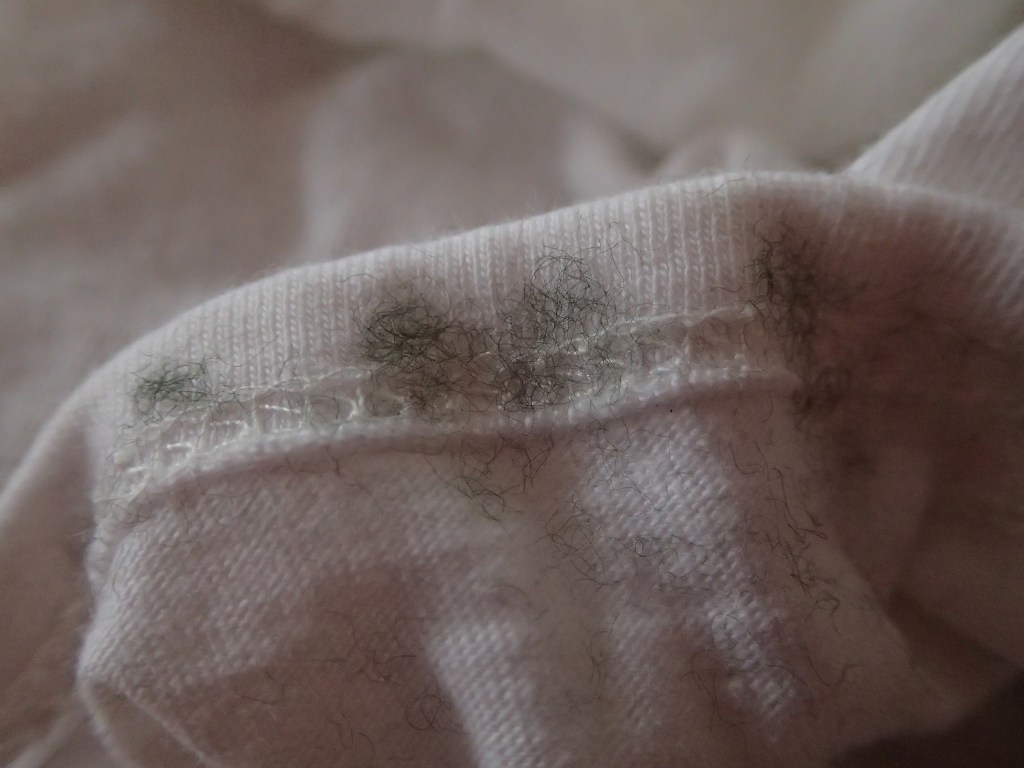 This was a conundrum! Firstly how was I supposed to get all the microfibre fuzz from the bag and the t-shirt into the bin? The inside of the bag was covered in it! Secondly what do I do with the jumper now? I can’t keep wearing it as I’ll forever be faced with the first problem. I can’t give it back to the op shop as it will just move the problem onto someone else. Is landfill the only option?