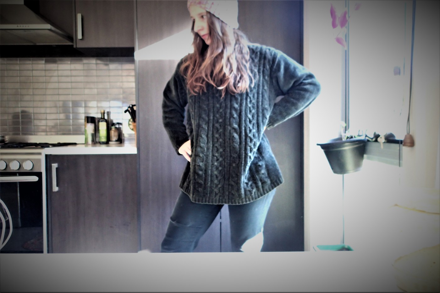 Because here we are, three years after that initial post and apparently I’ve slipped back into my old habits. I stumbled across a little goldmine of an op shop and loaded myself up with warm winter jumpers. In the mix was a jumper I’d selected to be my around the house bestie. It was warm, cosy and oversized. It also happened to be made from polyester but finding it increasingly harder to find 100% natural fibres in the op shop I put that downfall aside.
